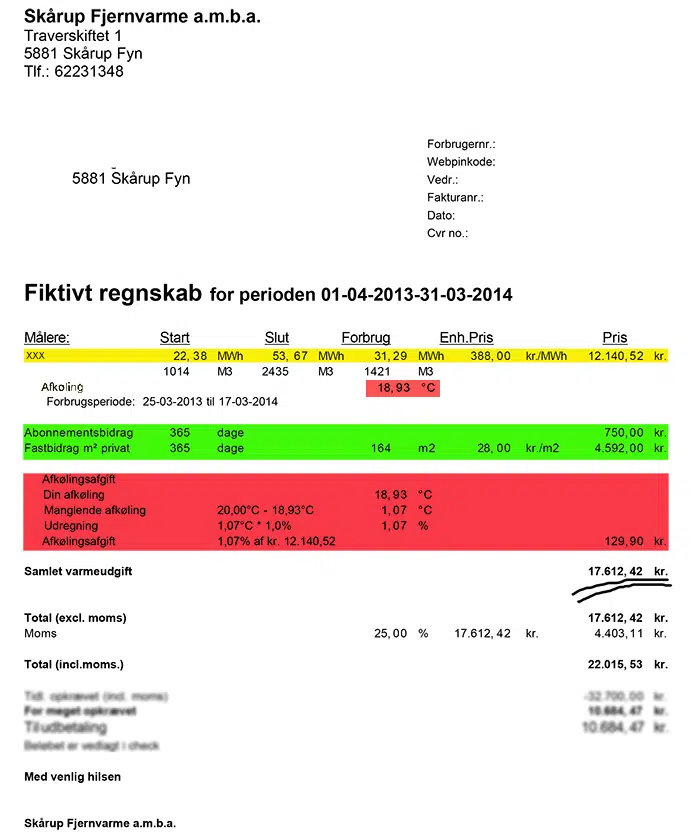 Nedenfor er der vist et fiktivt regnskab hvor du kan se forbrug, faste bidrag samt afkølingsafgift, som det vil fremgå på din opgørelse (regnskab).